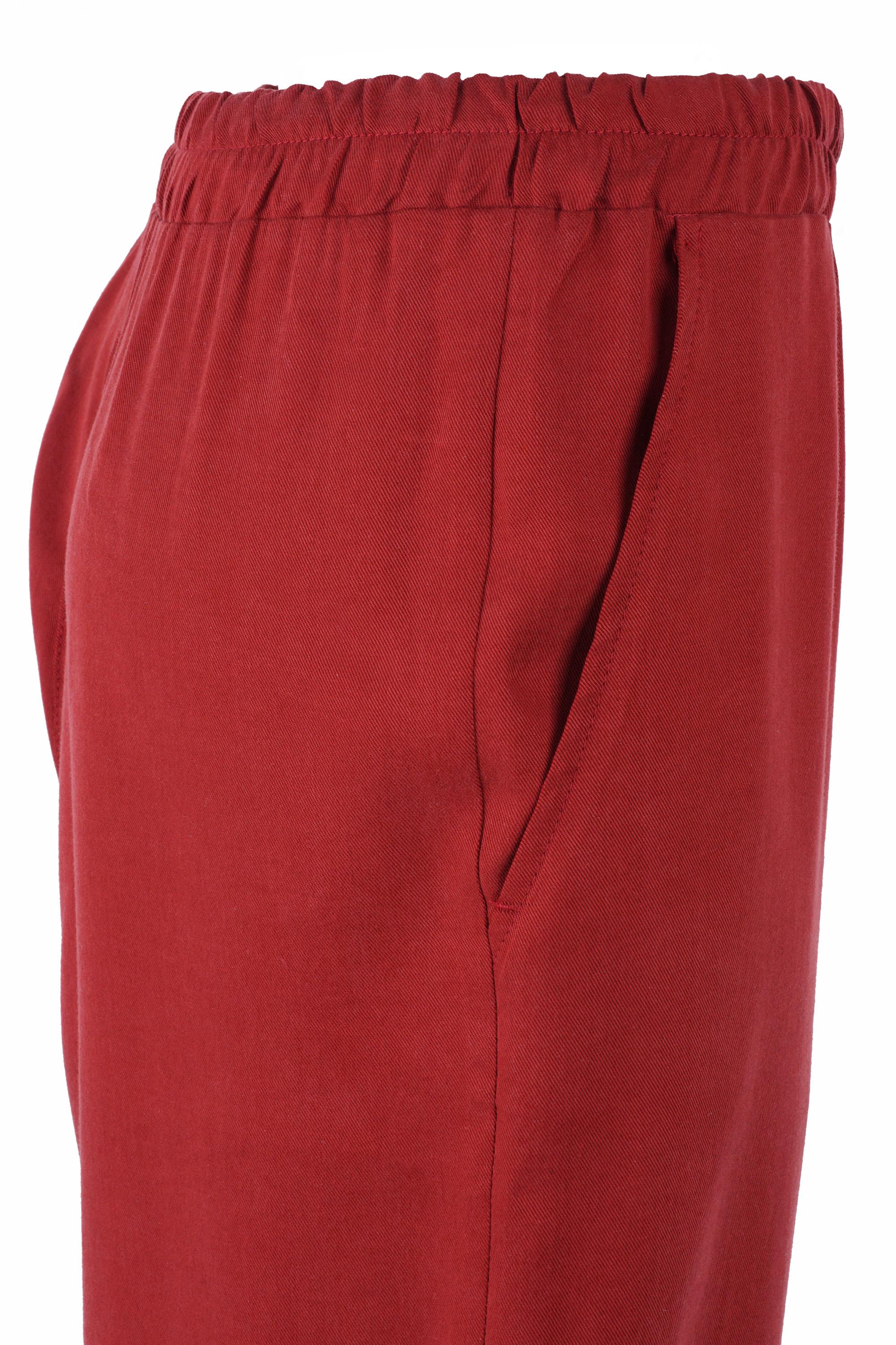 Das schöne, leicht in einen Braunton übergehende Rot verleiht der Hose Wärme und lässt die Trägerin Naturverbundenheit ausstrahlen.