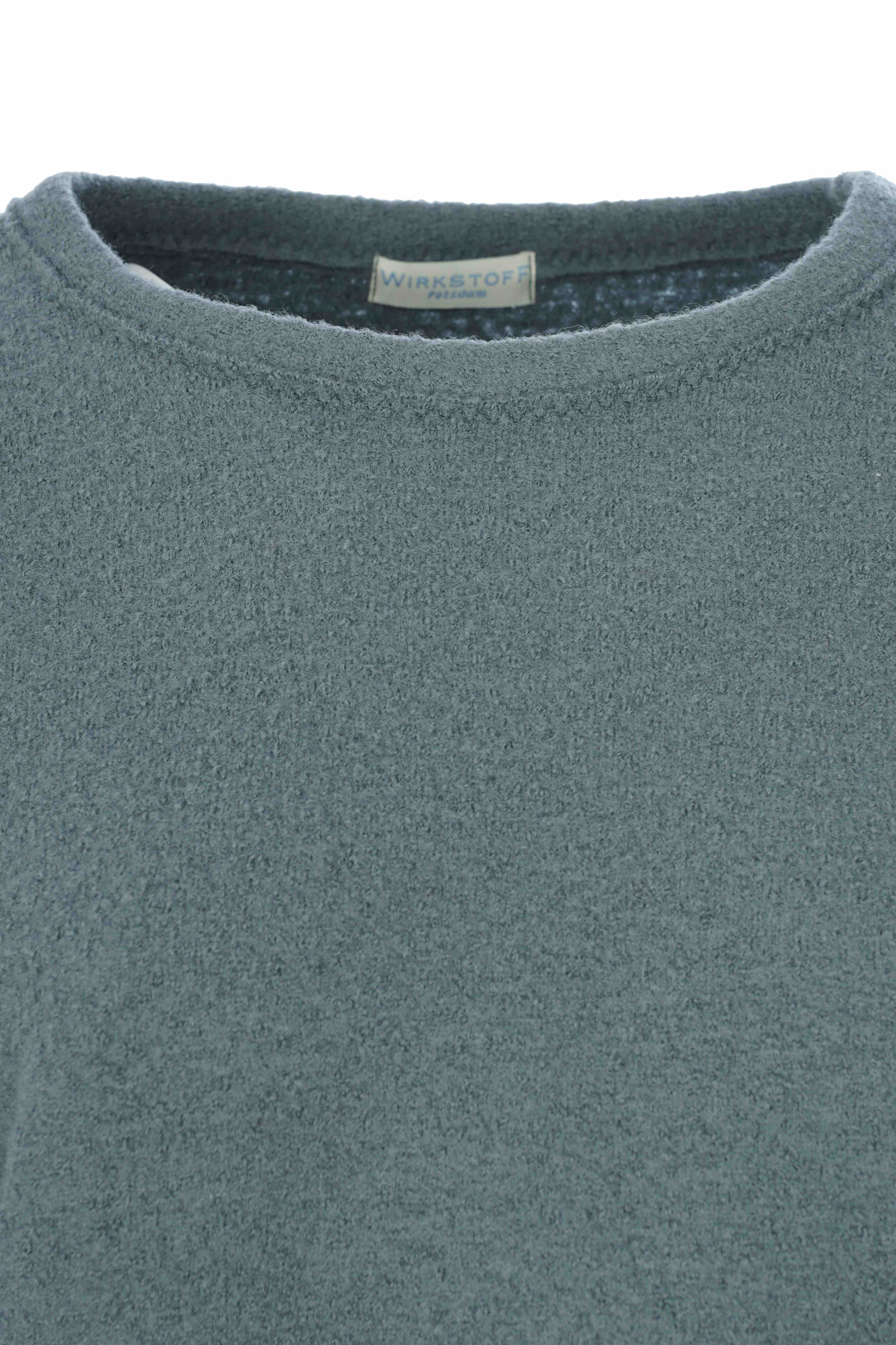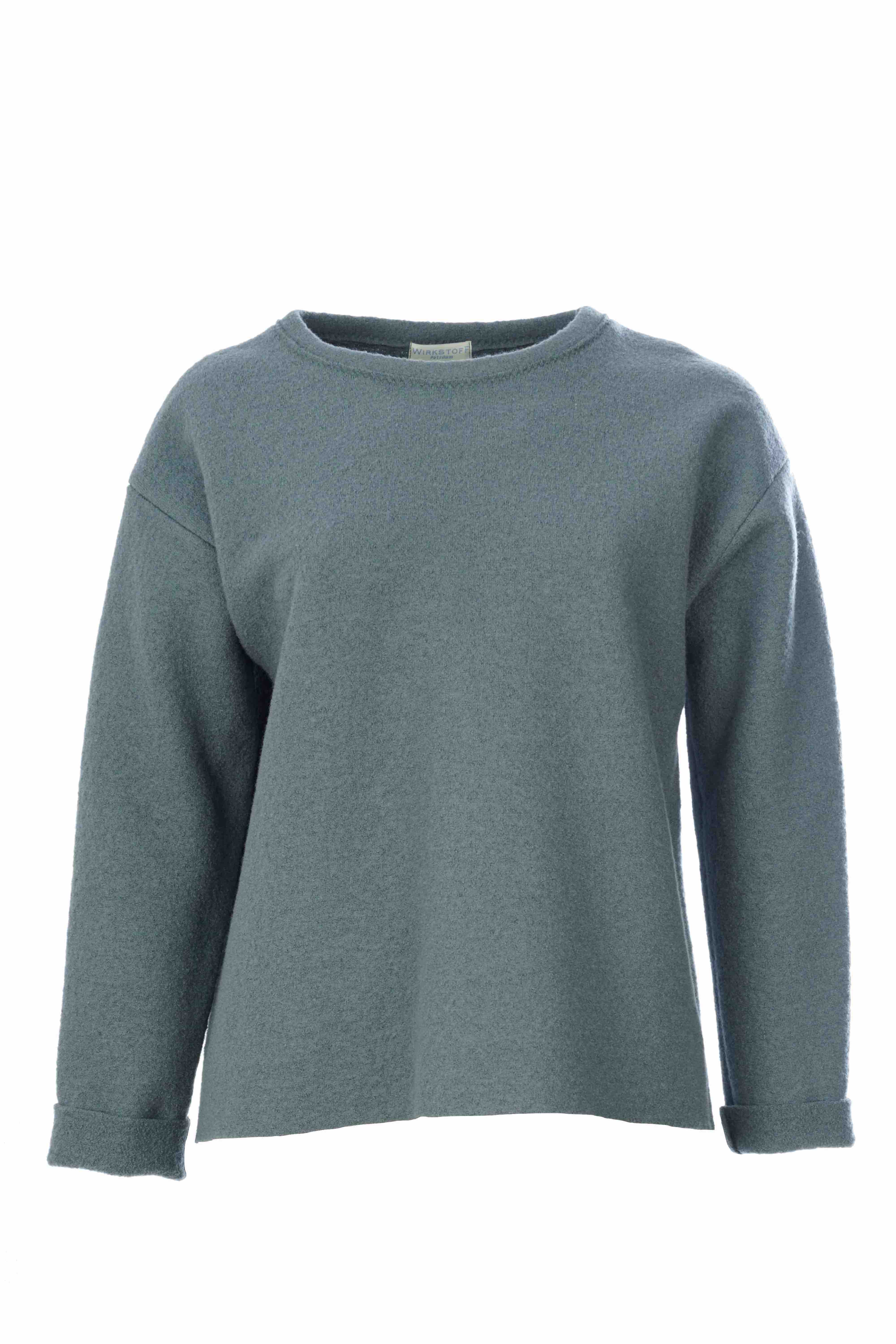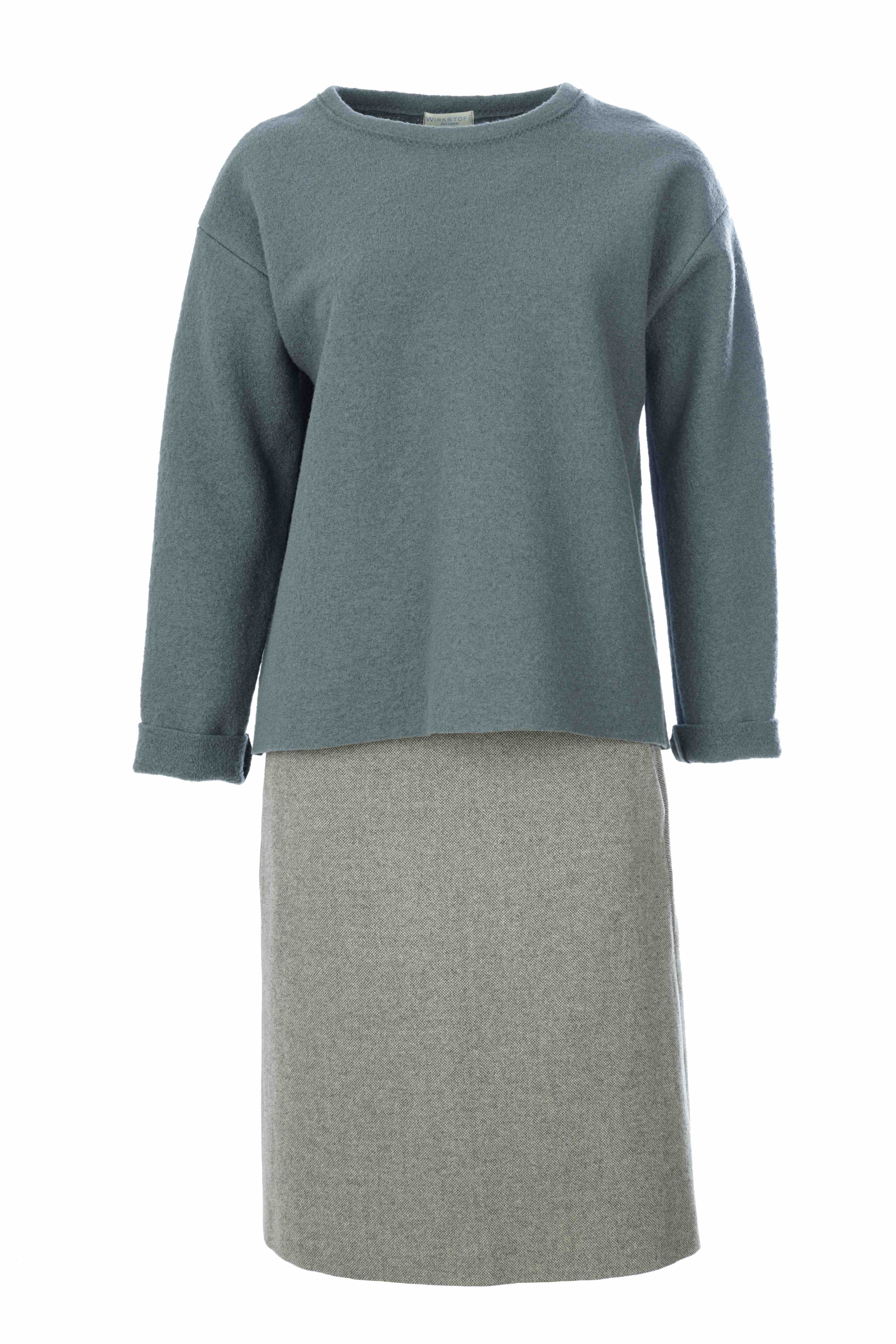 Mein Wirkstoff Wohlfühlpulli ist aus reiner italienischer Schurwolle. Die Wolle ist naturbelassen, ohne Kunstharzausrüstung oder chemischen Mottenschutz. In der Übergangszeit eignet sich der Pulli prima als Jackenersatz. Der weiche Walkstoff in silbrigem hellen Grün passt perfekt zu meinen Röcken in A-Linie.