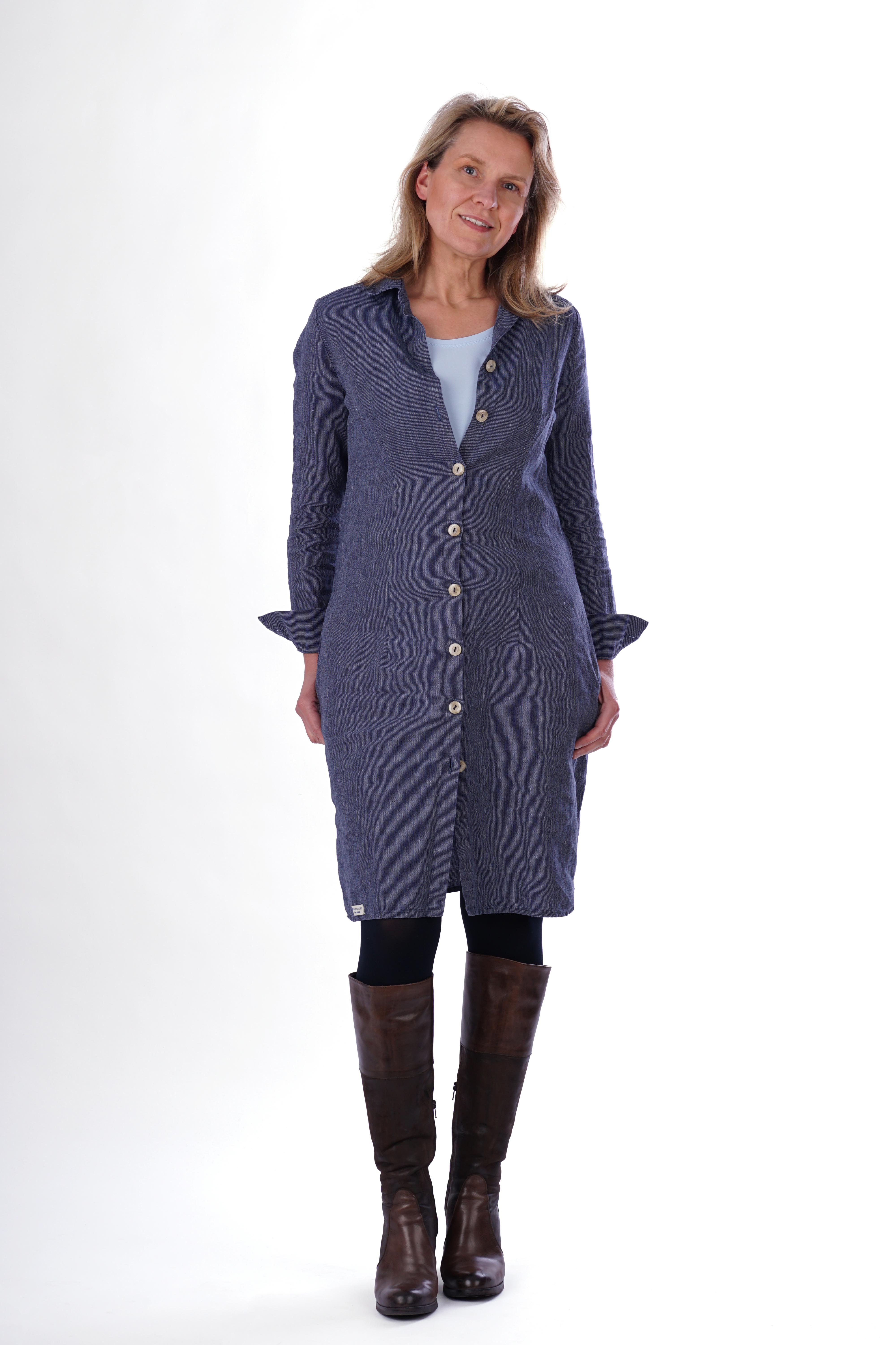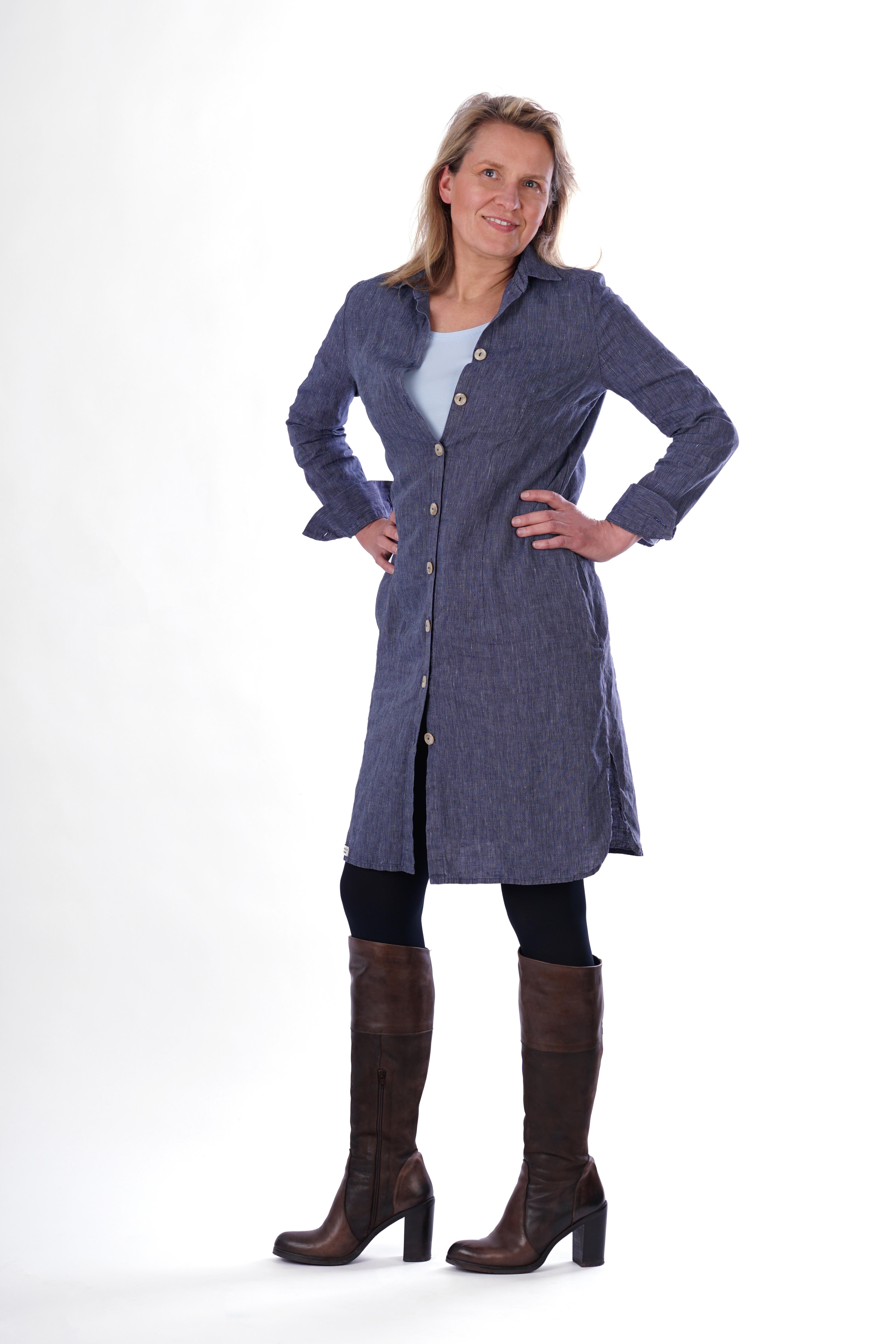 Meine Hemdblusenkleider strahlen Gelassenheit aus. Sie sind leger weit geschnitten und dabei leicht figurbetont. Nachhaltigkeit ist mir sehr wichtig. Bei Kleidung heißt das für mich auch, dass ein Stück gut kombiniert werden kann und über mehrere Jahreszeiten hinweg getragen wird. Im Sommer lasse ich Langarmshirt und Strumpfhose weg. Legerer geht es nicht. Der unkomplizierte Leinenstoff des Kleides ist pflegeleicht, hat einen festen Griff und fusselt nicht. Das Knittern des Stoffes ist ein Merkmal des echten, edlen Leinens.