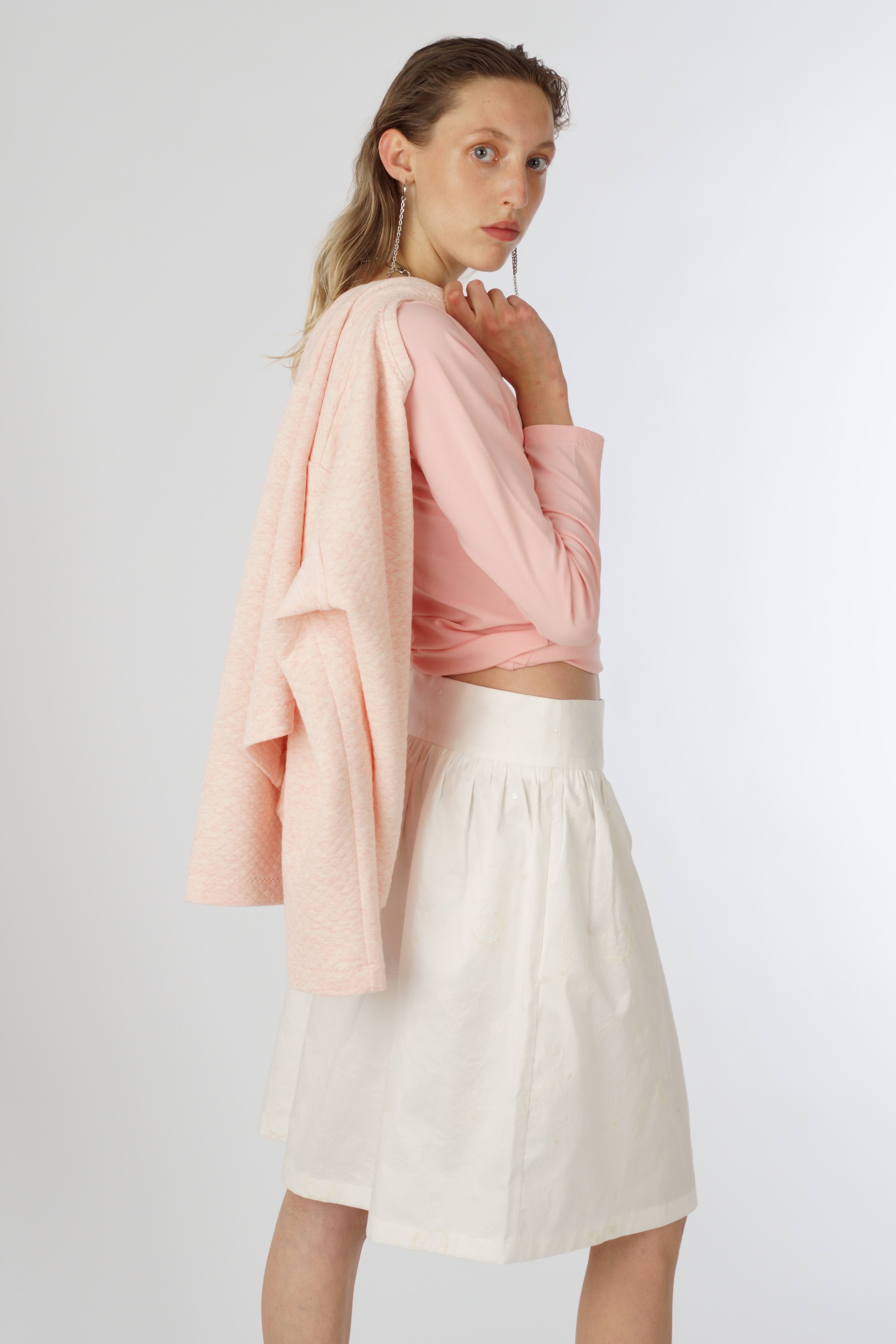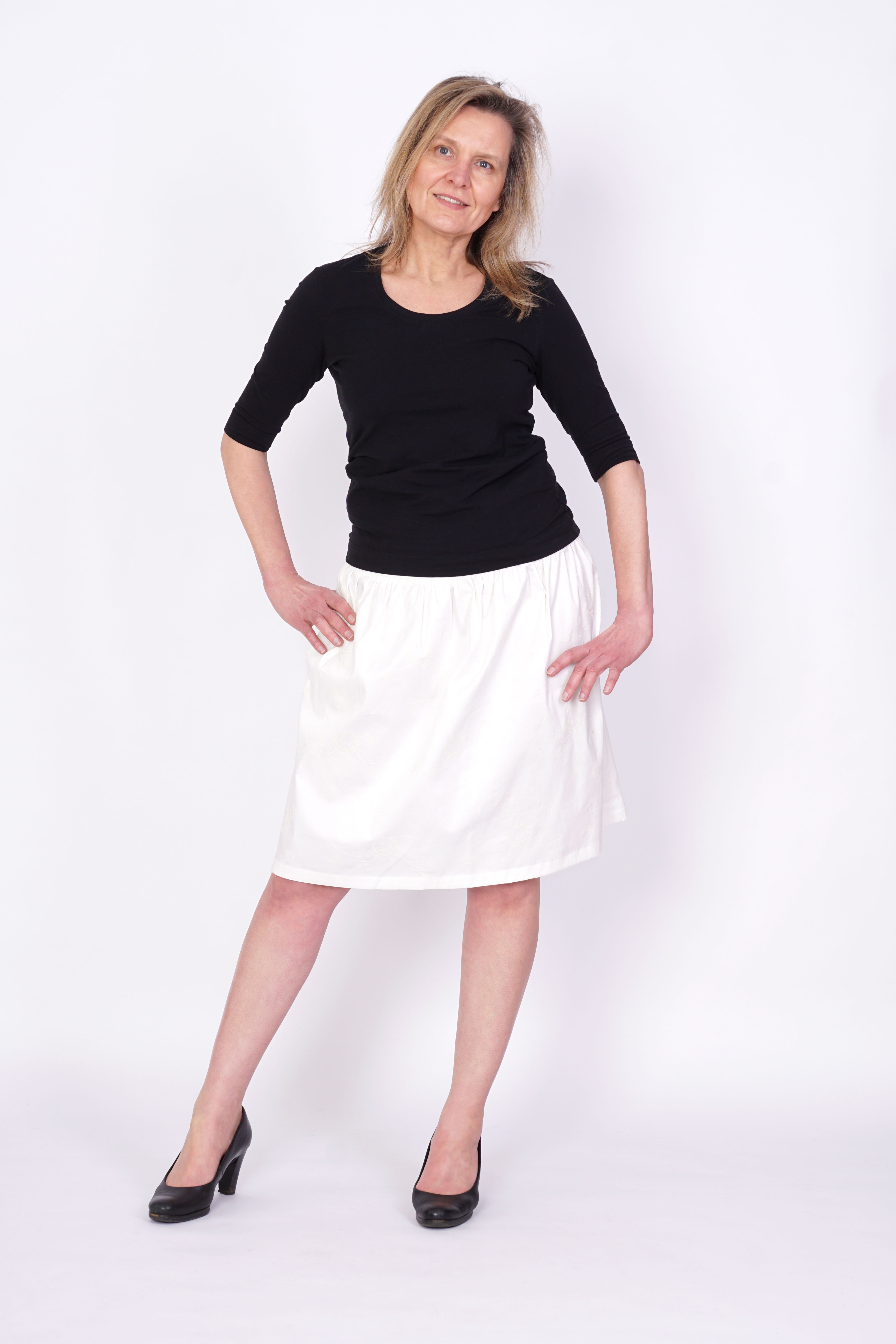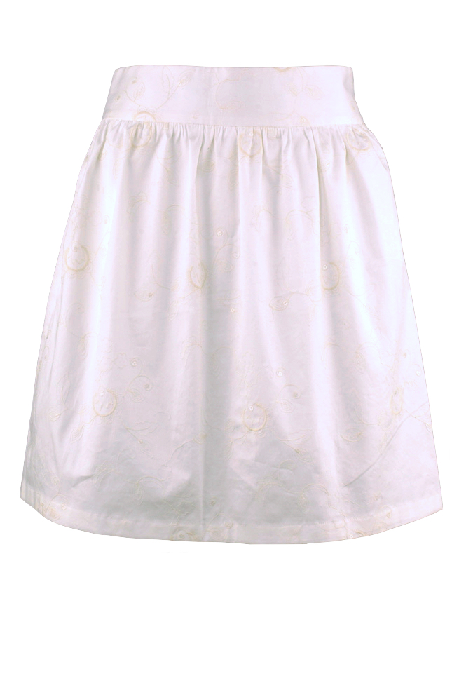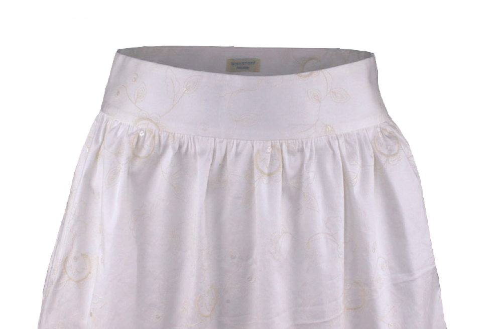 Weiter Rock mit Formbund, Reißverschluss auf der linken und einer Tasche für Kleines auf der rechten Seite.