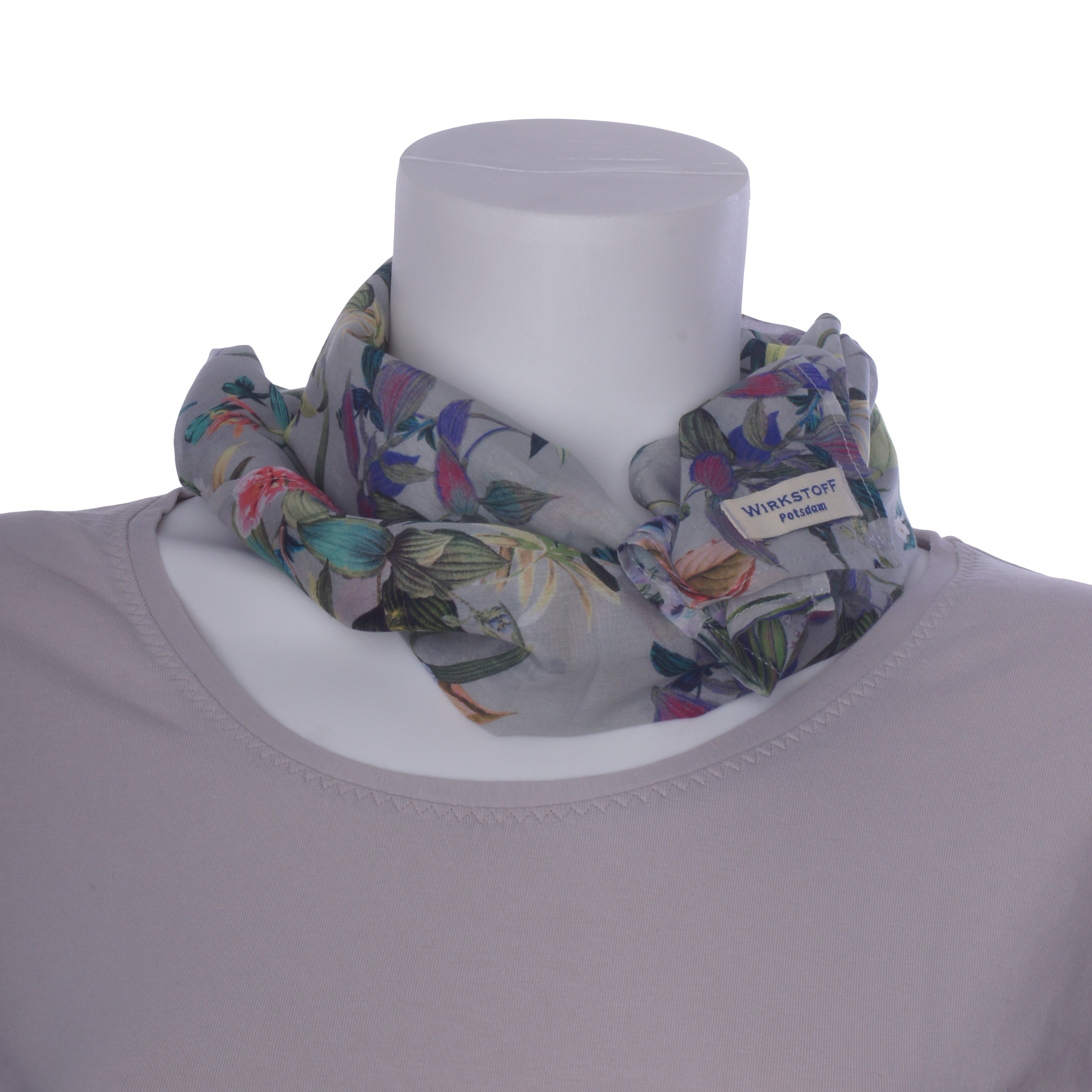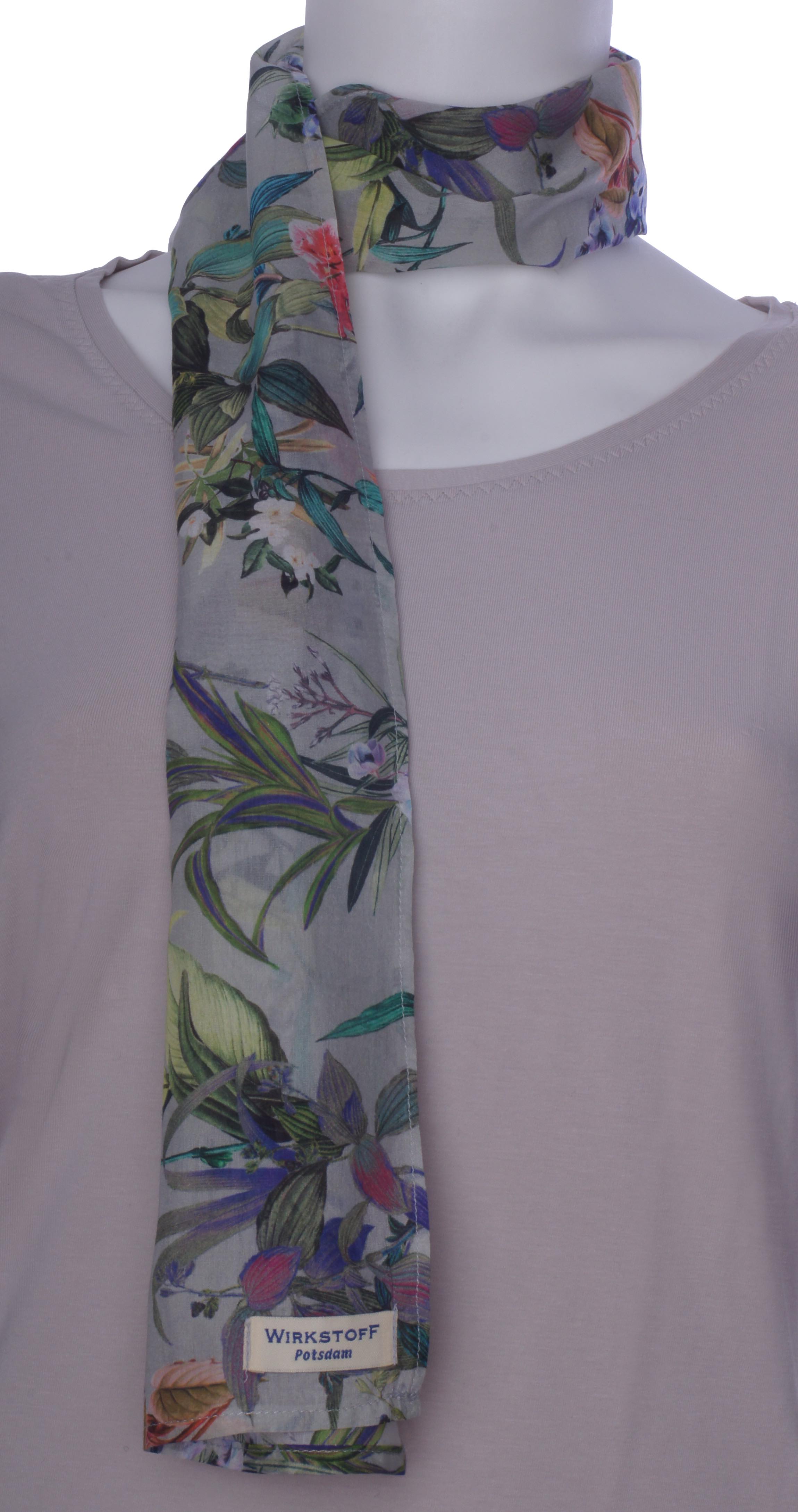 Sehr leichter Sommerschal in blassgrünem Grundton, verziert mit gestreuten Lilien in allen Grün- und Violetttönen.