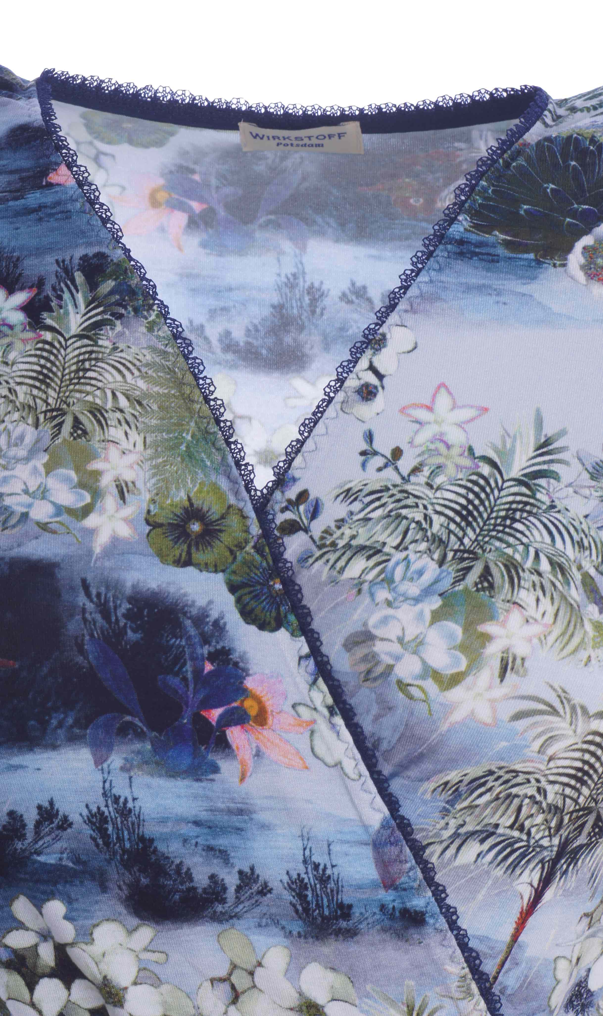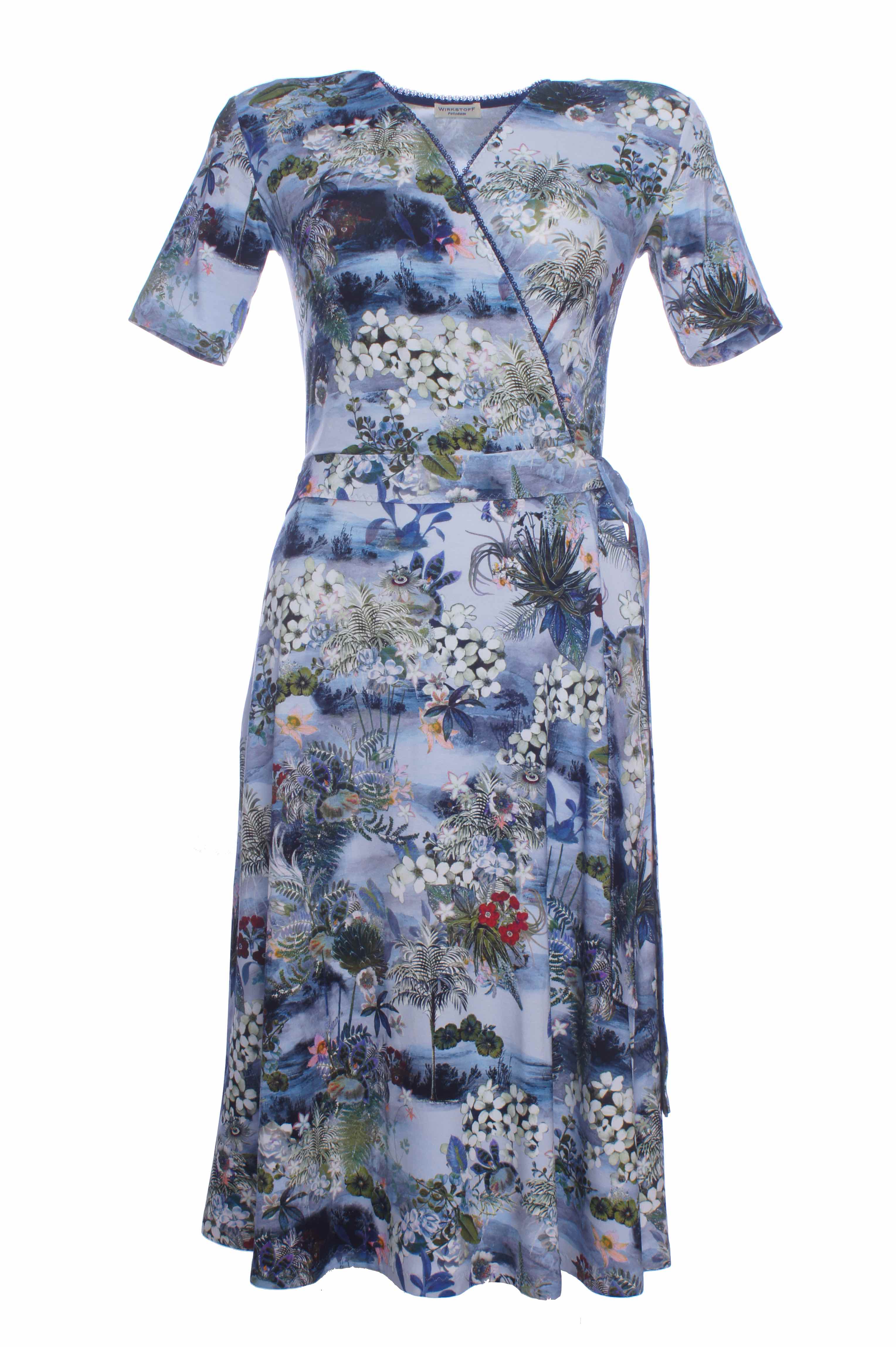 Ein Sommerabend am See! Kühlender, nach OEKO-TEX®100 zertifizierter Viskose-Jersey mit intensivem, hochwertigem Farbdruck. Das Kleid bekommt durch die Viskose einen tollen Schwung. Geringer Elasthananteil für den perfekten Sitz. Der überlappende V-Ausschnitt ist mit dunkelblauer Spitze eingefasst. Seitlicher Bindegürtel für die individuelle Passform. Zum Hineinschlüpfen.