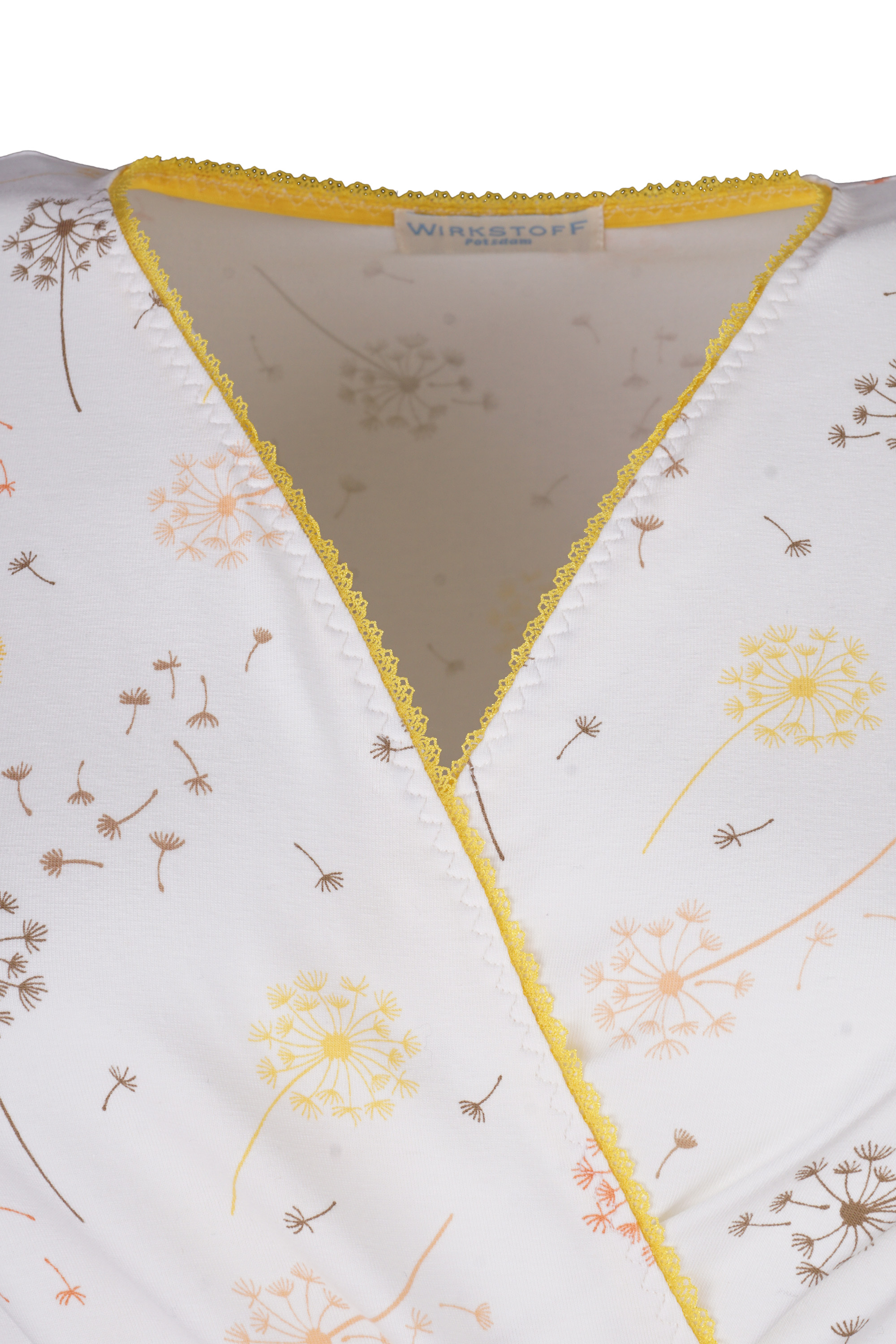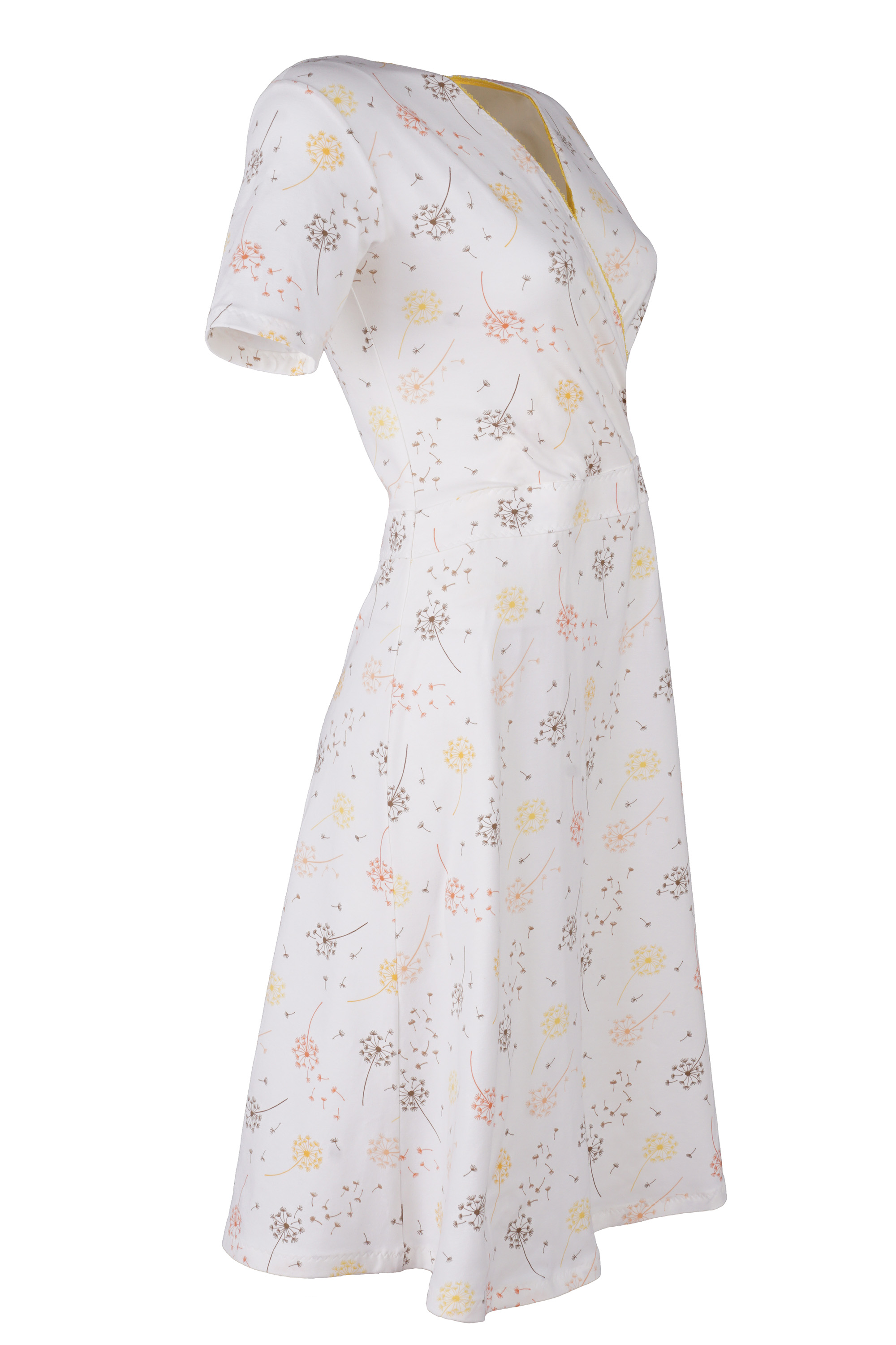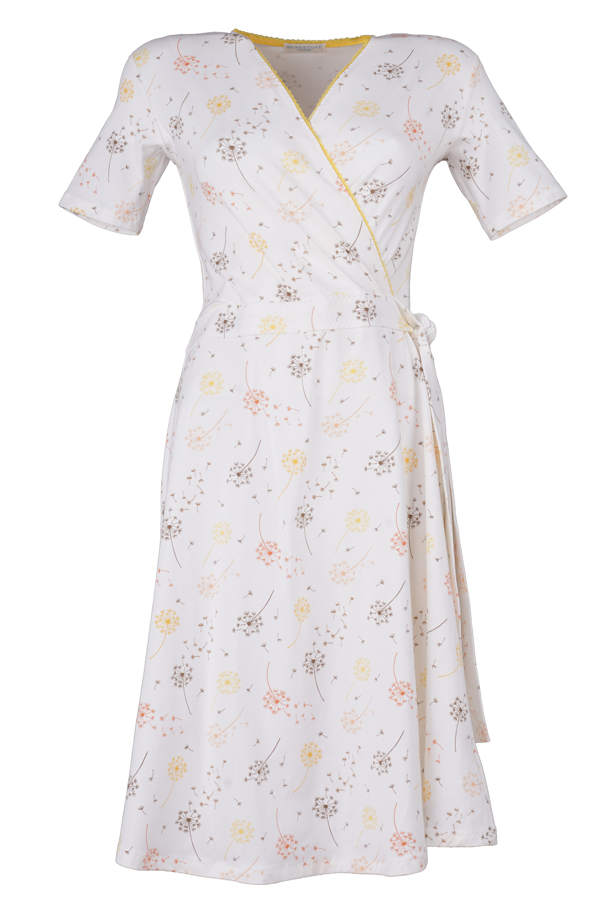 Das Kleid mit fliegenden Pusteblumen, gedruckt in Brau, Gelb und Orange auf blickdichtem, lichtweißem Grund ist aus hochwertiger Biobaumwolle gefertigt und hat eine Wickeloptik. Dadurch bleibt das Kleid immer sicher geschlossen und ist durch Hineinschlüpfen einfach anzuziehen. Ein seitlich zu bindender Gürtel sorgt für den perfekten Sitz an den richtigen Stellen.